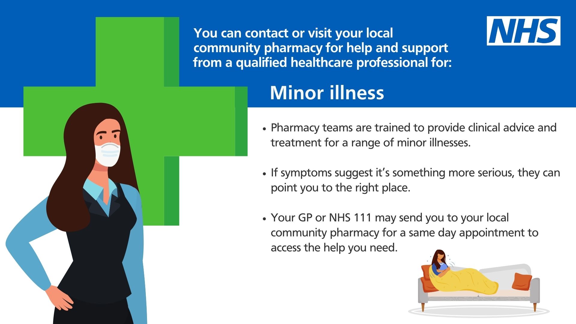 “Community pharmacists are experts in medicines and can help you with minor health concerns. Pharmacy teams work with other professionals, such as doctors and nurses, to give you the best possible care as part of the local NHS healthcare team. Your GP practice or NHS 111 may send you to your local community pharmacy for a same day appointment to access the help you need.