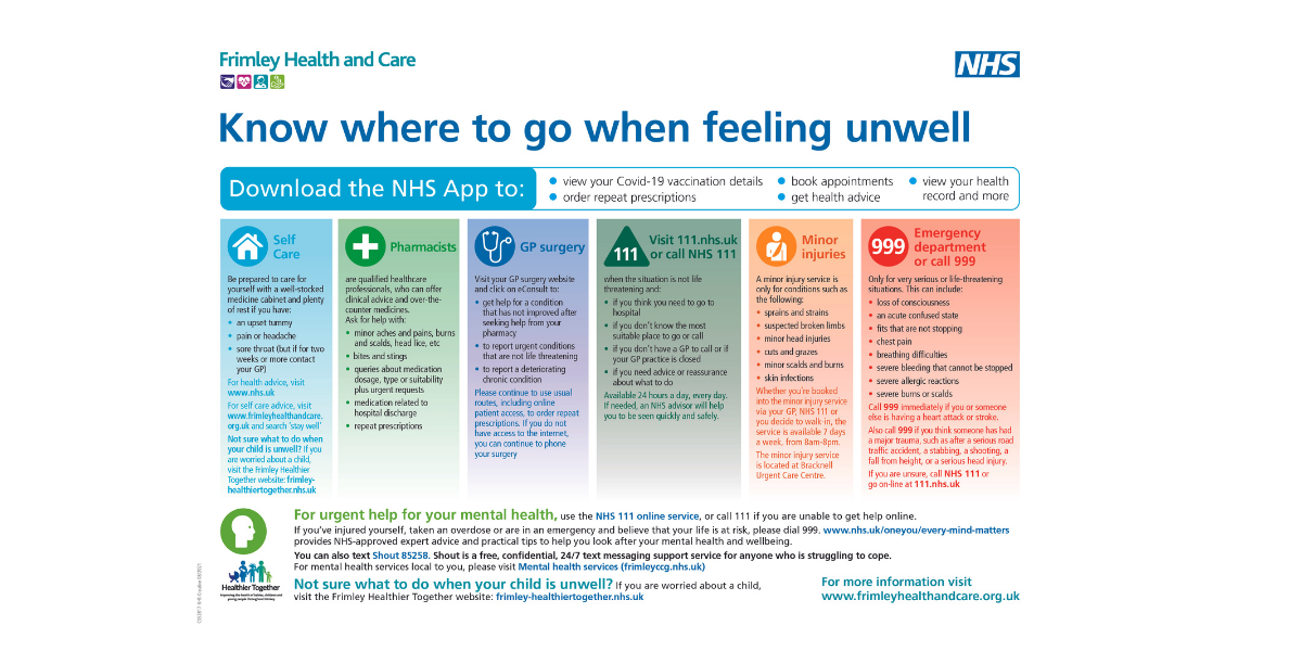 Dr Huw Thomas is the Clinical Chair of NHS Frimley Clinical Commissioning Group (CCG), the organisation which plans and funds the majority of services delivered to approximately 800,000 people in East Berkshire, Surrey Heath and North East Hampshire and Farnham. He said: “Knowing where to go for medical advice or treatment – and knowing basic first aid – is very important because it means that if we become unwell or we injure ourselves, we’re not wasting time and energy trying to find out what we should do or having to go round the houses to get where we need to be.