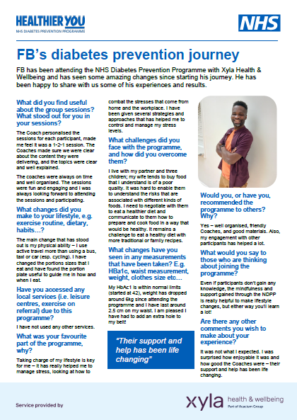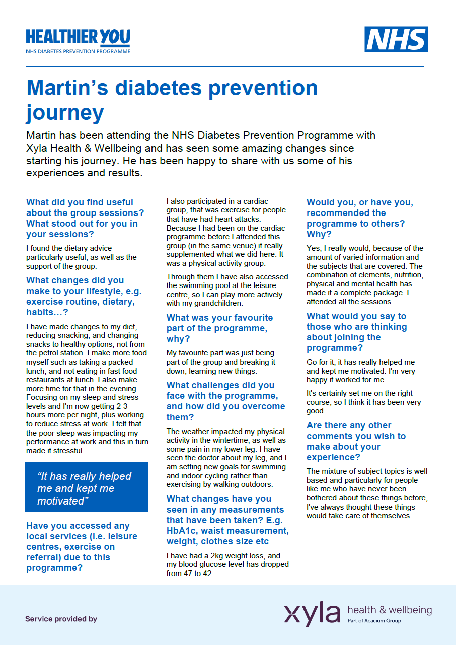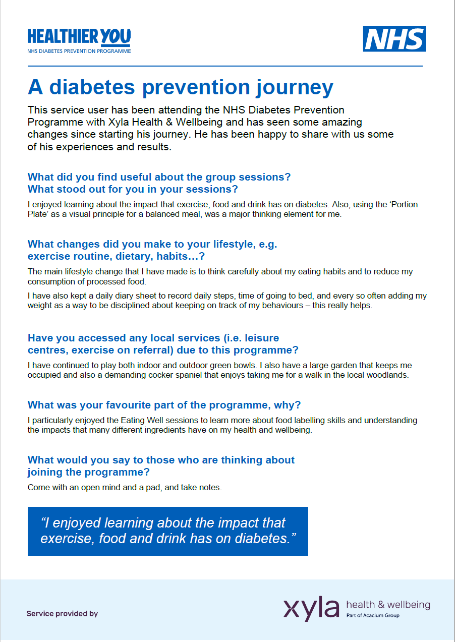 The programme provides tailored, personalised support to reduce your risk of type 2 diabetes. You’ll have the chance to learn about making small changes to encompass healthy eating, achieving/maintaining a healthy weight and becoming more active. This combination of lifestyle changes is proven to prevent the disease.